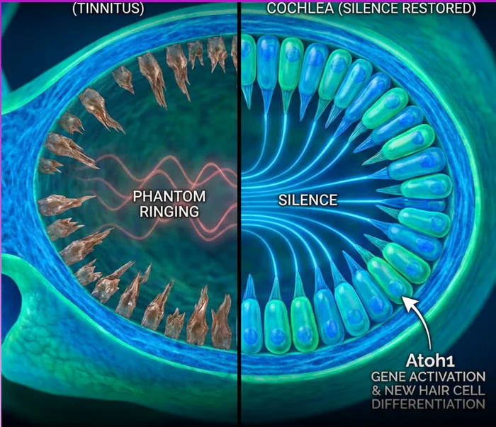 Cercetătorii au utilizat vectori virali pentru a introduce gena Atoh1, considerată un regulator principal al diferențierii celulelor ciliate. Odată activată, această genă a permis celulelor de susținere să se transforme în celule senzoriale noi în termen de două săptămâni. Acestea s-au integrat în circuitele neuronale ale cohleei, restabilind procesarea normală a sunetului și eliminând semnalele care provocau țiuitul.