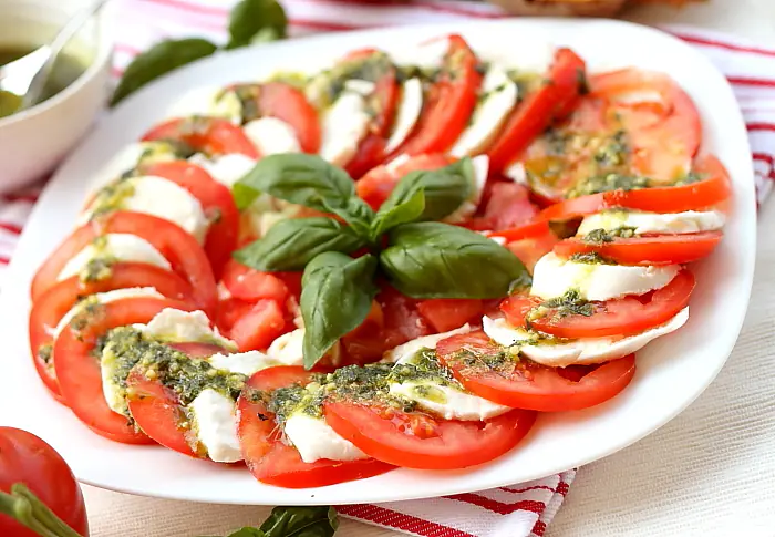 Variațiune cu pesto: Înlocuiește frunzele de busuioc cu o linguriță de sos pesto distribuită peste feliile de mozzarella.